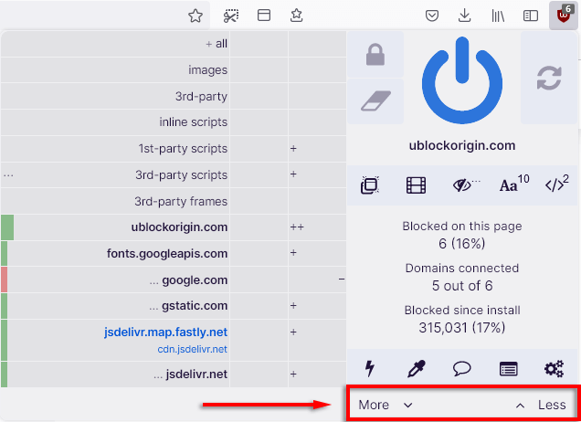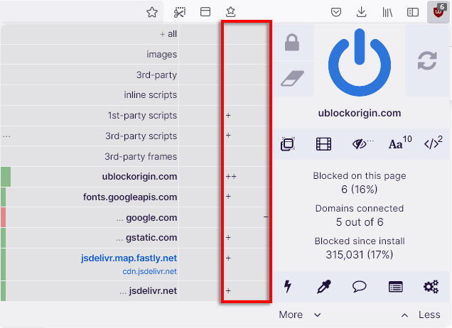 Le filtrage dynamique permet aux utilisateurs d'ajouter des règles qui remplacent le filtrage statique, offrant ainsi un contrôle supplémentaire sur le type de contenu que vous pouvez bloquer ou autoriser. Ceci peut être activé en cliquant sur leicône uBOet en sélectionnant leMoinsetPlusboutons.