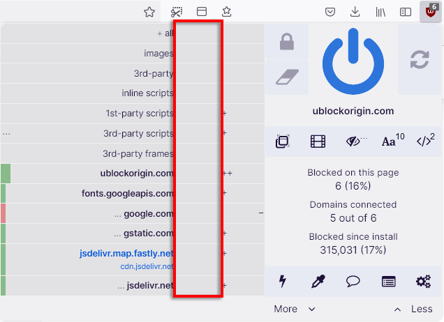 Avec le filtrage dynamique activé, en cliquant sur leicône uBOça ressemble maintenant à ça :