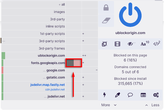 De plus, vous constaterez peut-être que le blocage de tous les cadres et scripts entraîne la panne d’un site Web. Si tel est le cas, c'est une question d'essais et d'erreurs en utilisant le bouton de remplacement local « noop » (la case grise dans la colonne locale) pour chaque domaine jusqu'à ce que le site Web fonctionne à nouveau.