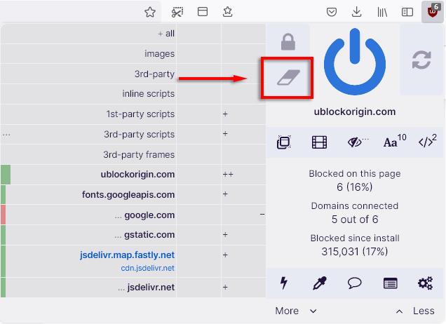 La mise en œuvre de blocs de contenu vous aidera à atteindre une confidentialité maximale, mais peut également entraîner la panne de nombreux sites Web. Dans cet esprit, uBO a facilité l’expérimentation. Vous pouvez effacer toutes les règles et recommencer en cliquant sur le boutongomme.