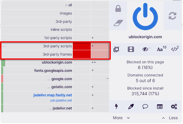 Il est généralement recommandé de bloquer globalement tous les cadres et scripts tiers. Ceux-ci sont comme des « sites Web intégrés à un site Web » et constituent souvent un maillon faible dans les sites Web que les acteurs malveillants cibleront avec des logiciels malveillants (en plus, ils sont ennuyeux).