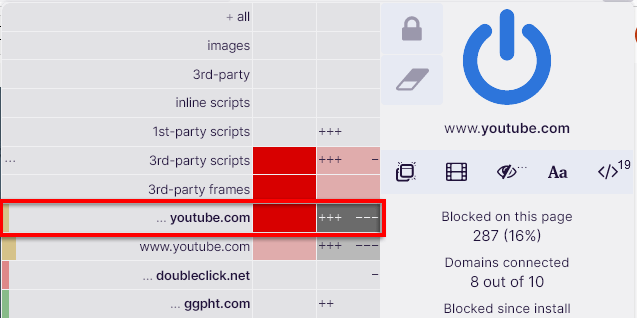 Mais disons que vous souhaitez pouvoir voir des vidéos YouTube intégrées sur un site Web particulier. Tout d'abord, vous devez faire défiler jusqu'àURL youtube.comet cliquez sur leboîte grisedans la colonne locale. Désormais, seules les images tierces YouTube seront chargées sur ce site.