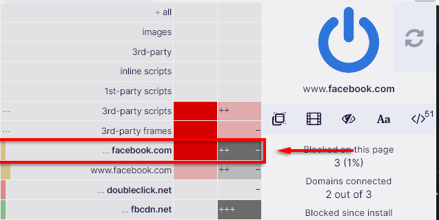 Il n’y a aucune raison pour que les sites de réseaux sociaux ou les moteurs de recherche puissent suivre votre activité en dehors de leurs plateformes. Pour bloquer leurs autorisations, ouvrez le tableau de bord uBO et cliquez sur leboîte rougedans la colonne globale de chaque URL de réseau social (par exemple, Facebook.com). Le seul problème est que cela les bloquera également lorsque vous essayez de charger directement le site Web.