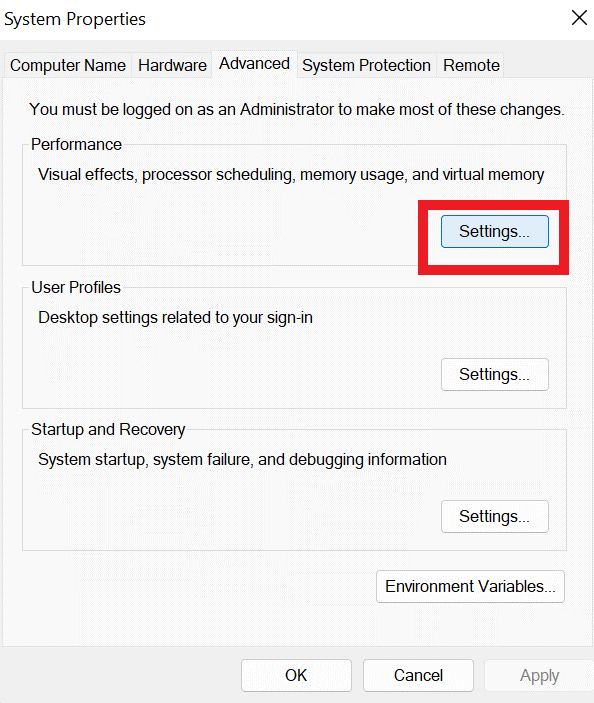- Quand lePropriétés du systèmela fenêtre s'ouvre, cliquez surParamètressousPerformance.