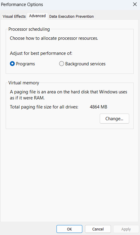 - Cliquez sur leChangementbouton sousMémoire virtuelle