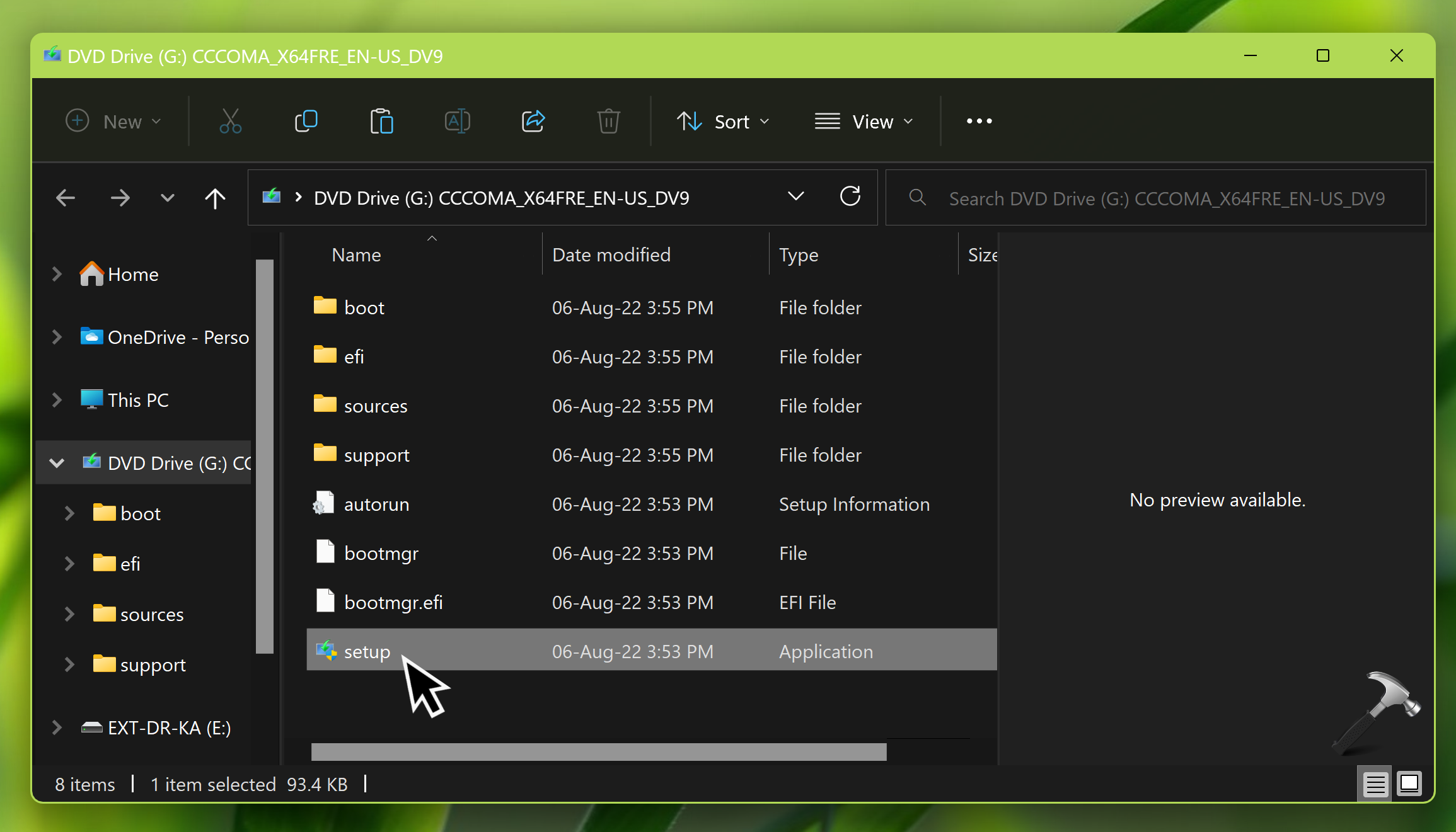 Une fois le fichier ISO téléchargé, vous pouvez simplement double-cliquer dessus et le monter sur un lecteur de DVD. Accédez ensuite au lecteur de DVD monté et double-cliquez sur lesetup.exefichier pour lancer l’installation de Windows 11 25H2.