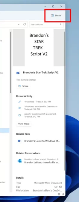 DansConstruire 23451de Windows 11, Microsoft a ajouté un volet « Détails » moderne dans l’Explorateur de fichiers. D'un simple clic sur un élément, la fonctionnalité affiche un aperçu d'un fichier sélectionné, y compris un aperçu de l'élément en haut, l'activité récente du fichier comme l'état partagé et les commentaires récents, ainsi que les fichiers et conversations associés.