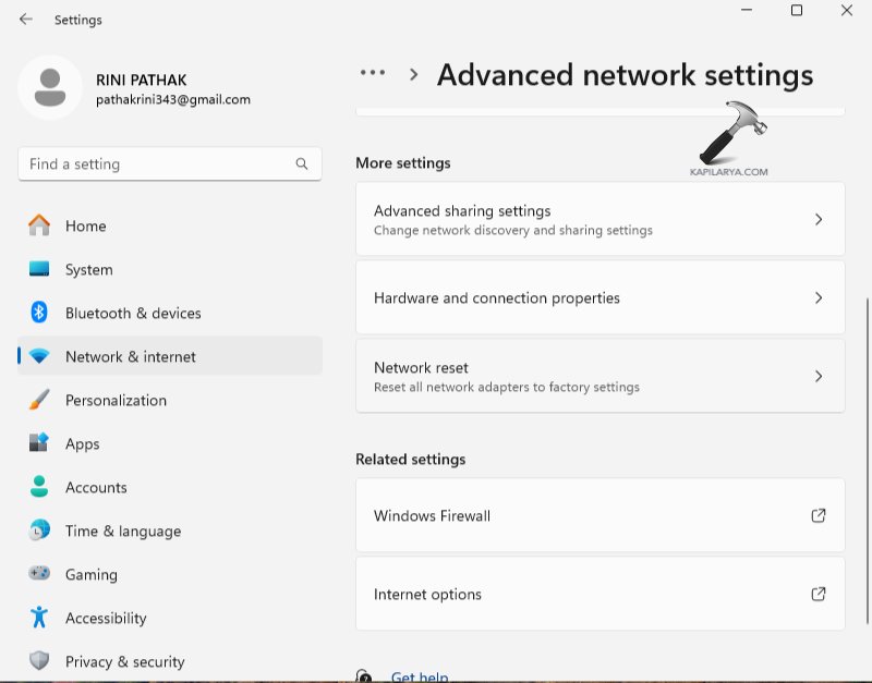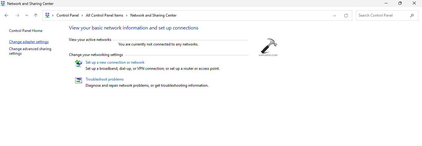 Étape 2 :Ensuite, visitez Centre Réseau et partage > Modifier les paramètres de l’adaptateur.