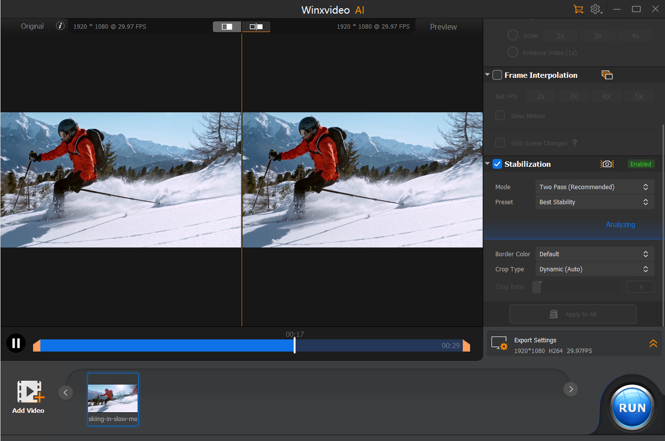Les mouvements tremblants de la caméra peuvent donner l’impression que même la vidéo la plus engageante est un enregistrement amateur. La stabilisation vidéo AI de Winxvideo AI neutralise efficacement le bougé de l’appareil photo et offre un produit final fluide et soigné. Que vous ayez les mains tremblantes ou que vous ayez capturé des images en déplacement, la stabilisation vidéo AI de Winxvideo AI garantit une vidéo stable et d'aspect professionnel. Cela vous permet de partager en toute confiance vos créations vidéo et de repousser vos limites de créativité et de présentation.