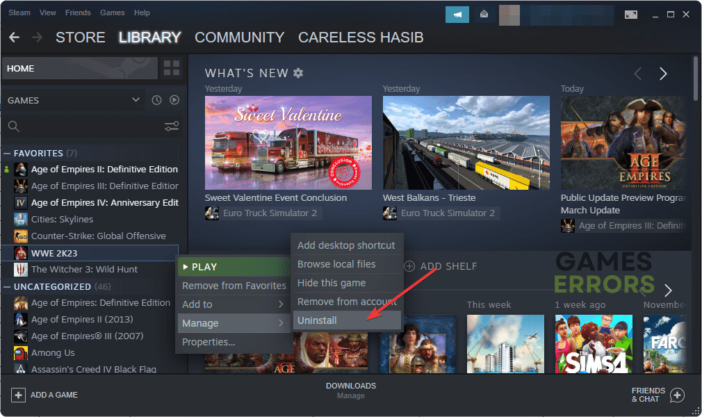 - Dans leBibliothèque de jeux Steam, faites un clic droit surWWE 2K23puis cliquez surDésinstaller.