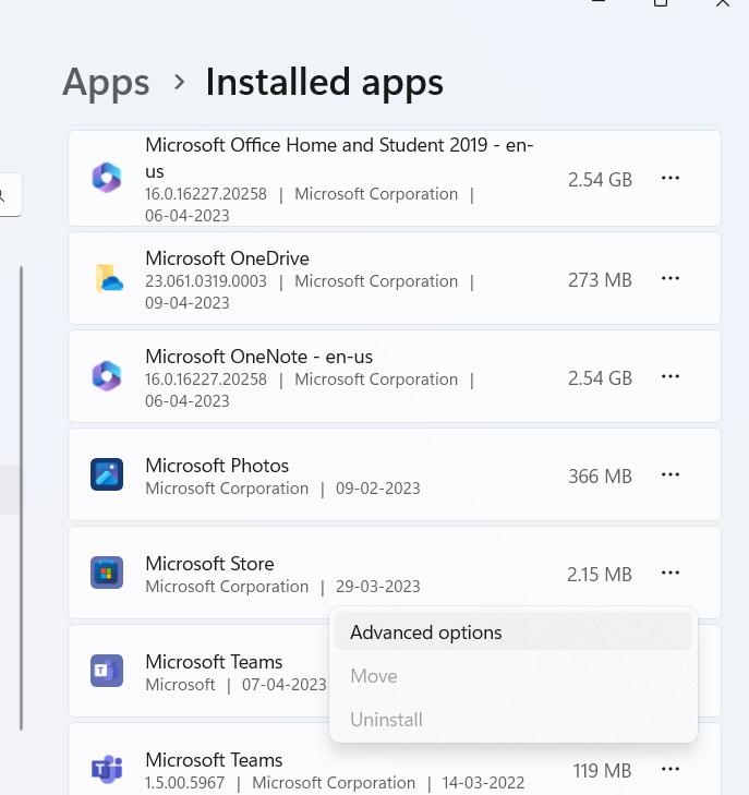 - Faites défiler vers le bas, localisezMicrosoftStore, cliquez sur les trois points horizontaux, puis cliquez surOptions avancées.