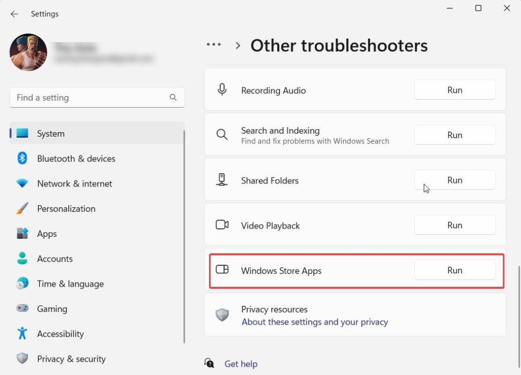 - SousAutrefaites défiler vers le bas et localisezApplications du Windows Store. Cliquez surCourirà côté.