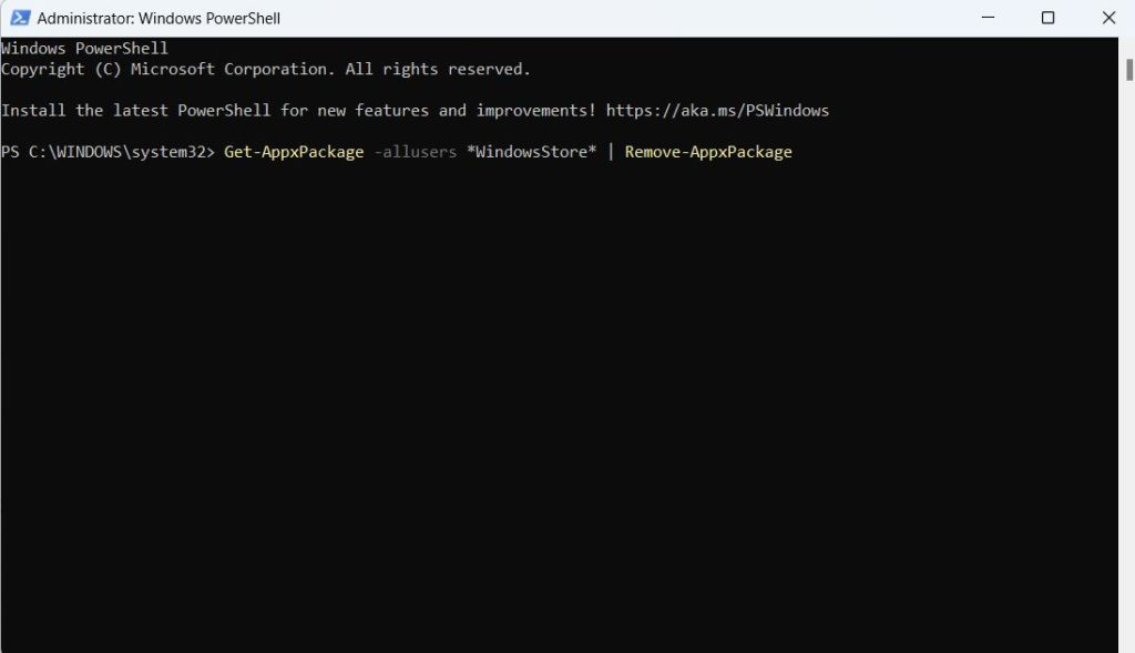 L'erreur 0x87E00017 peut indiquer qu'il y a un problème avec l'application Windows Store sur votre ordinateur. Le mieux ici est de désinstaller puis de réinstaller l’application Microsoft Store. Cela peut être fait via Windows PowerShell (administrateur) –