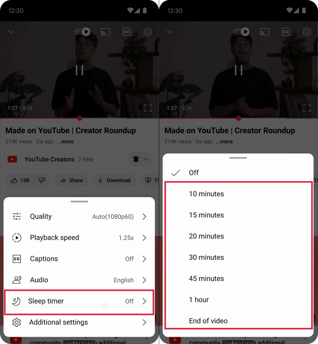 Le premier sur la liste est Sleep Timer. Auparavant réservé aux membres Premium, Sleep Timer est désormais disponible pour tous les utilisateurs de YouTube. N'importe qui peut désormais configurer YouTube pour mettre automatiquement en pause les vidéos sur son appareil mobile après une durée spécifiée. Les options prédéfinies de la minuterie d'arrêt sont 10 minutes, 15 minutes, 20 minutes, 30 minutes, 45 minutes et 1 heure. Il existe également une option « Fin de la vidéo » qui exécute le minuteur pendant toute la durée de la vidéo.