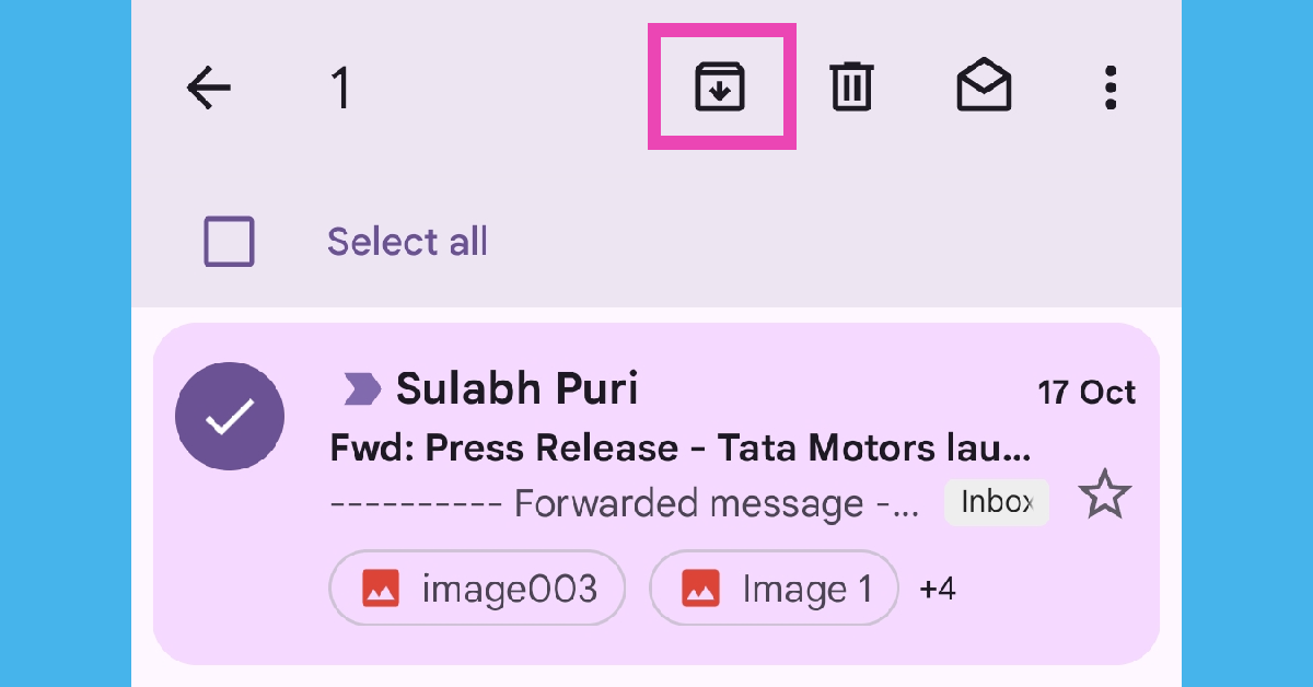 Étape 3 :Alternativement,appui longl'e-mail et appuyez sur leicône d'archives(flèche vers le bas à l’intérieur d’une case) en haut de l’écran.