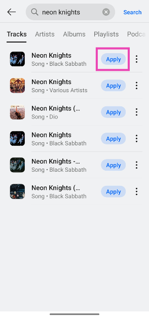 Étape 6 :Frappez leicône de recherchedans le coin supérieur droit de l’écran pour rechercher une chanson. Alternativement, vous pouvez appuyer surAppliquerà côté d'une chanson suggérée pour la définir comme alarme.