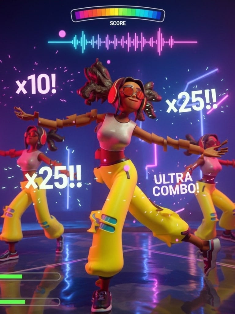Une capture d'écran vibrante d'un jeu de danse rythmique mettant en vedette trois mêmes personnages animés en 3D de la photo de référence, conservant sa coiffure unique, ses écouteurs, ses lunettes de soleil, son pantalon jaune sportif et sa pose de danse confiante. Éclairage cinématographique immersif avec une lueur rose fluo et violette, piste de danse réfléchissante brillante brillant sous les projecteurs, style dessin animé 3D dynamique. Interface de jeu rythmique avec interface utilisateur immersive : compteur de score en haut, animations de forme d'onde musicale colorées synchronisées avec le rythme, compte à rebours du chronomètre de scène et numéros de combo flottants. Ambiance de jeu très détaillée avec des barres énergétiques, des effets de particules de néon et des éléments HUD de jeu de rythme d'arcade immersifs. Animation 3D ultra détaillée, cinématographique et immersive.