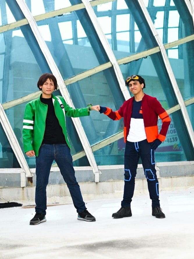 Prenez les deux hommes et placez-les dans les poses exactes de l'homme en vert portant l'homme en rouge. Préservez leur identité, leurs proportions corporelles et les détails de leurs vêtements. Assurez-vous que la pose est naturelle et réaliste, avec un éclairage, des ombres et une perspective cohérentes. Résultat photoréaliste et haute résolution.