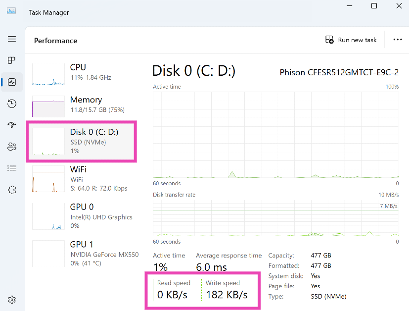 Vérifiez la vitesse du SSD à l'aide du Gestionnaire des tâches
