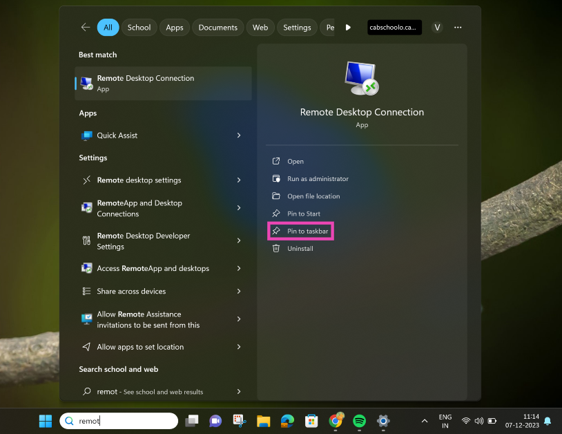 Tapez Connexion Bureau à distance dans la zone de recherche de la barre des tâches et sélectionnez « Épingler à la barre des tâches » dans les options de l'application.