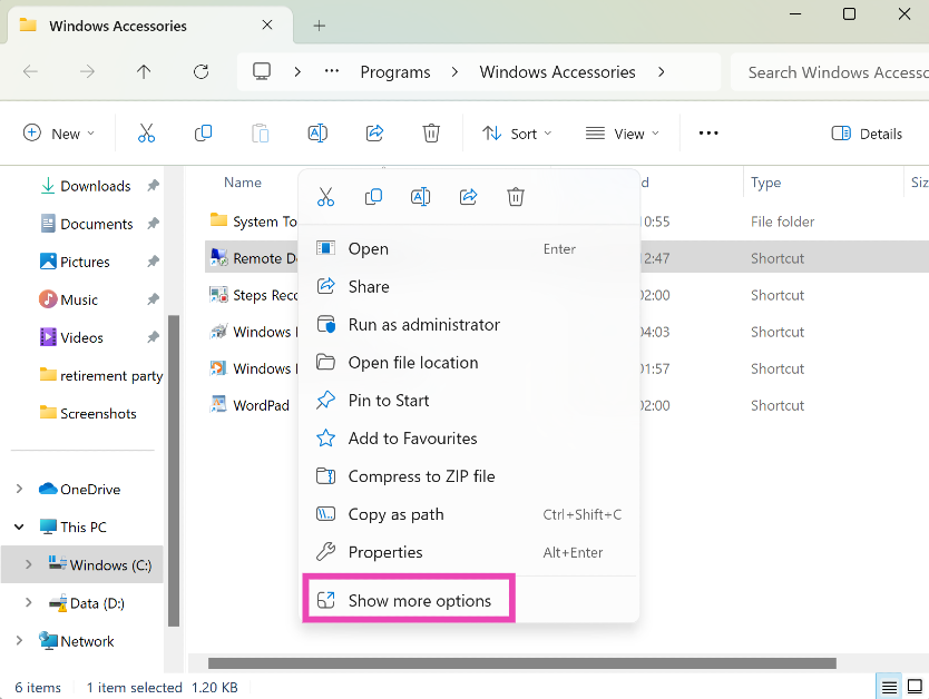 Étape 3 : Clic droitsur Connexion Bureau à distance et sélectionnezAfficher plus d'options.