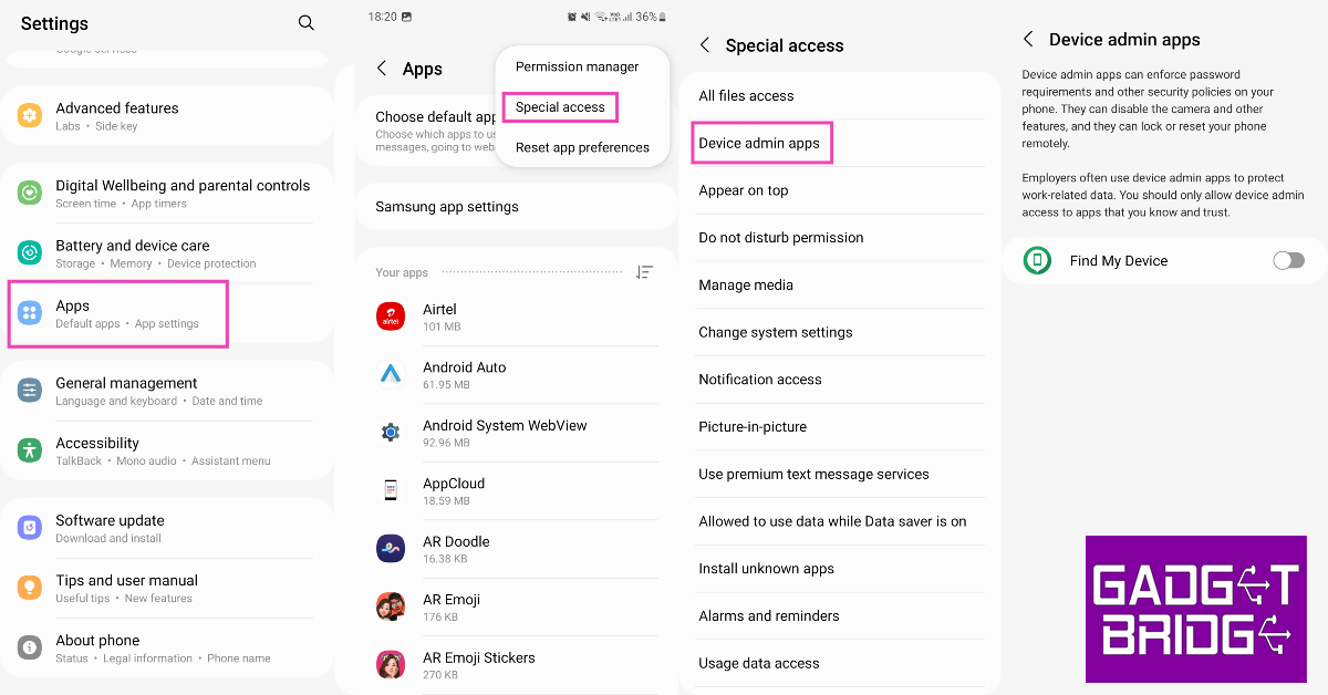 Les applications de logiciels espions et de logiciels de harcèlement nécessitent un accès administrateur sur votre appareil pour atteindre leur objectif. Les applications tierces que vous téléchargez depuis le Play Store ou l’App Store demandent très rarement cet accès. Aller àParamètres> Applications> Options> Accès spécial> Applications d'administration de l'appareilet voyez quelles applications ont accès aux paramètres d'administration. Si vous remarquez une application inhabituelle qui ne devrait pas être là, supprimez-la de votre appareil. Les applications de stalkerware peuvent également être déguisées en quelque chose d’inoffensif sous le nom d’« Horloge » ou de « Calculatrice ». Ces types d’applications n’ont aucune raison de rechercher un accès administrateur et doivent être supprimés immédiatement.