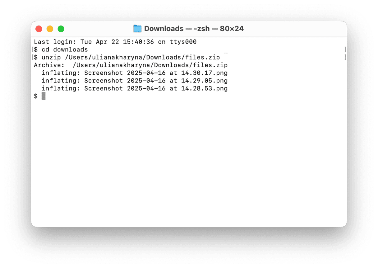 Si vous souhaitez l'avoir dans un emplacement spécifique, tapezcdsuivi du nom de cet emplacement avant d'exécuterunzipcommande. Par exemple, tapezcd desktopsuivi de Retour si vous souhaitez le désarchiver sur le bureau oucd downloadssi vous avez besoin de ces fichiers dans le dossier Téléchargements. Ensuite, exécutez la commande.