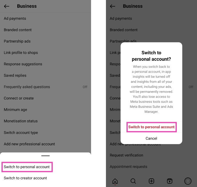 Étape 6 :Appuyez surPasser au compte personnel/créateur.