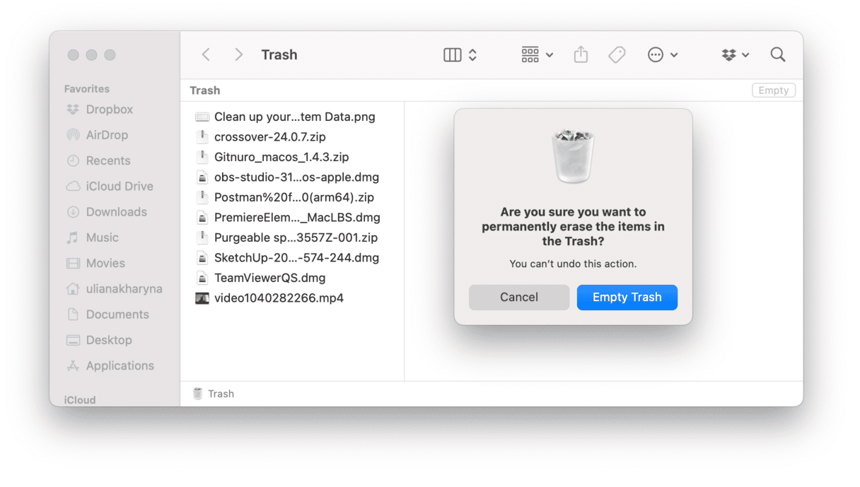 Même si vous avez supprimé les fichiers, ils résident dans votre corbeille, occupant beaucoup d'espace de stockage sur votre Mac. Ils attendent juste d'être complètement supprimés. Si vous souhaitez récupérer votre précieux espace sur votre disque dur, vous devez vider la corbeille.