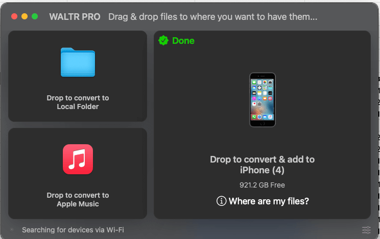 Waltr Pro est un peu différent. Il offre une interface glisser-déposer qui transférera les fichiers multimédias sur votre iPhone soit lorsqu'il est branché, soit sans fil via AirDrop. Il coûte 9,95 $ par mois et est disponible pour Mac et Windows.