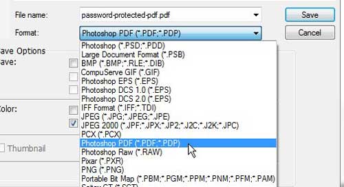 Étape 4 : Cliquez sur le menu déroulant à droite deFormat, cliquez sur lePhotoshopPDFoption, puis cliquez sur l'optionSauvegarderbouton.