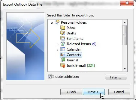 Cliquez sur leExporter vers un fichieroption, puis cliquez sur l'optionSuivantbouton. Certaines options de format de fichier sur cet écran pourraient s'avérer utiles si jamais vous avez besoin de migrer vos informations de contact vers un autre programme de messagerie, mais, pour l'instant, choisissez l'optionFichier de données Outlook (.pst)option, puis cliquez surSuivant. Cliquez sur leContactsdossier au centre de la fenêtre, puis cliquez surSuivant.