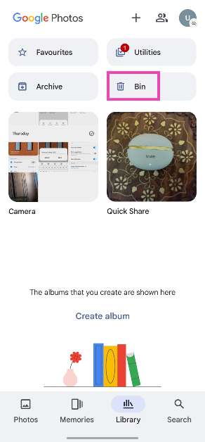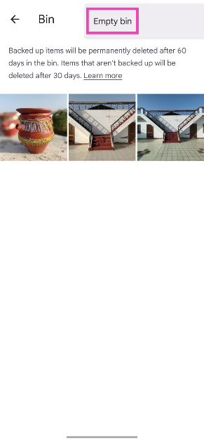 Étape 4 :C'est ici que vous trouverez votreimages récemment supprimées. Appuyez sur leellipseset sélectionnezBac videpour effacer le dossier.