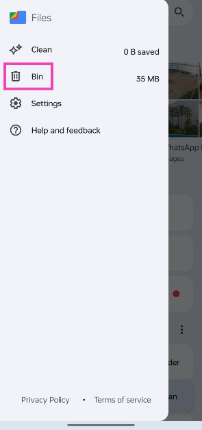 Appuyez sur l'icône du menu hamburger dans le coin supérieur droit de l'écran pour accéder à la corbeille sur Google Files.