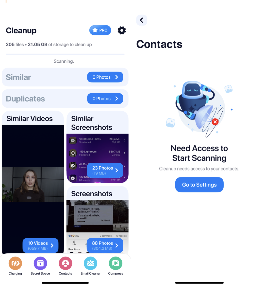 Nettoyant Boostdispose d'une interface utilisateur claire, qui analyse votre bibliothèque et vos contacts à la recherche de doublons. Il dispose également d’un outil de compression pratique pour les vidéos volumineuses.
