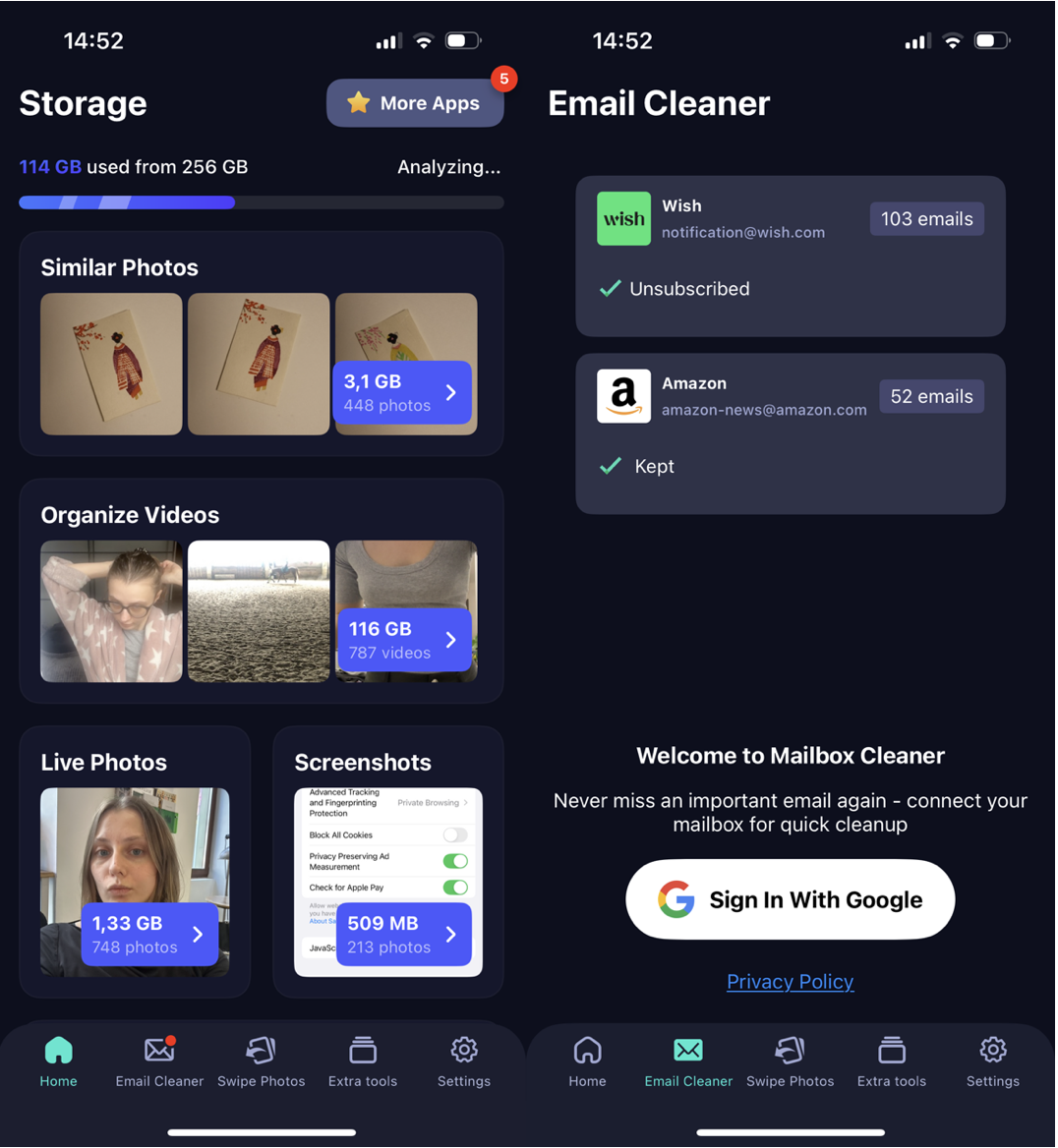 Nettoyageest un outil relativement connu avec de grandes capacités. Cette application peut ranger vos contacts, photos et e-mails. Vous pouvez parcourir les recommandations de suppression de photos, les utiliser complètement hors ligne et profiter de différentes options d'abonnement.