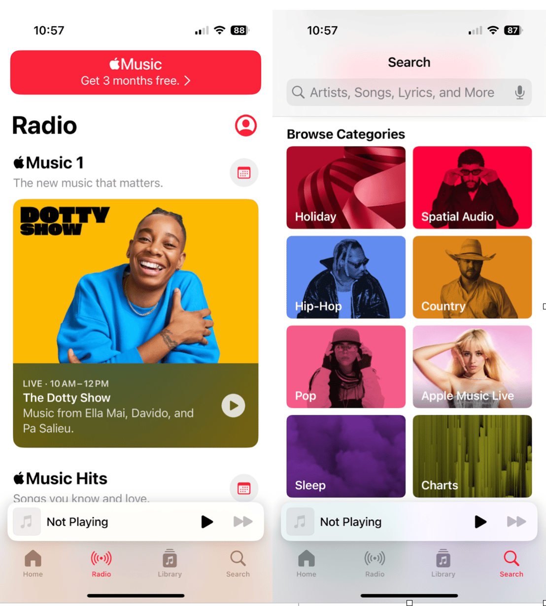 Apple Music est un choix par défaut pour de nombreux utilisateurs d'iPhone, offrant l'accès à une vaste bibliothèque de chansons. L'application vous permet de télécharger de la musique pour une écoute hors ligne une fois abonné. Avec des listes de lecture organisées et des recommandations personnalisées, Apple Music garantit que vous ne manquerez jamais un rythme.