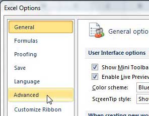 Étape 4 : CliquezAvancédans la colonne à gauche duOptions Excelfenêtre.