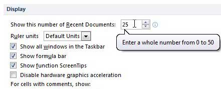 Heureusement, il est possible demodifier le nombre de documents récents dans Excel 2010à presque n'importe quel numéro que vous voulez. Vous pouvez même choisir qu'Excel 2010 n'affiche aucun document récent.