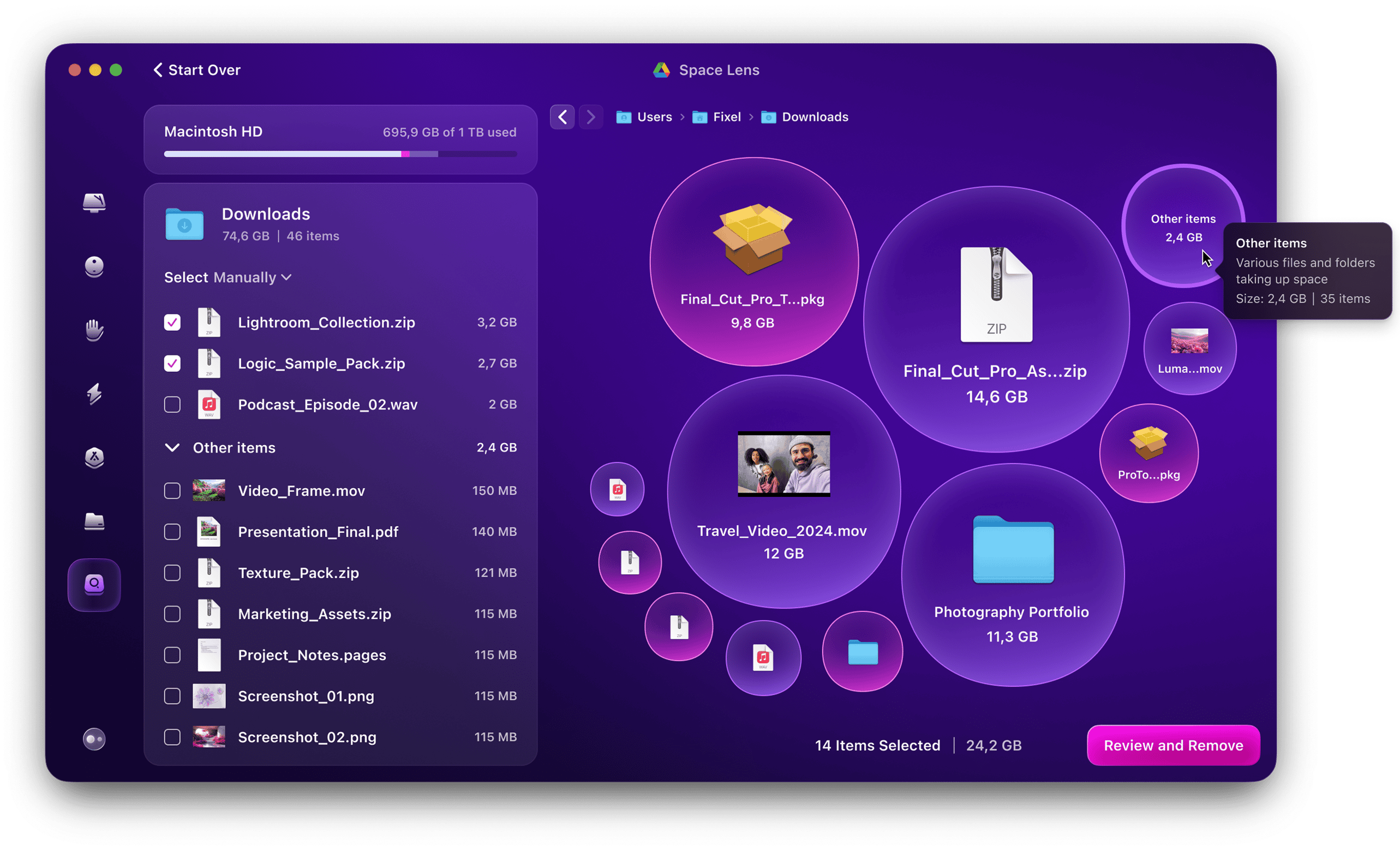 Space Lens reprend le même concept visuel et le fait évoluer. La mise en page est interactive et élégante, et semble intégrée dans un flux de nettoyage plus large. Cela ne vous montre pas seulement où va l’espace ; il met en évidence ce qui peut être supprimé en toute sécurité, ce qui est ancien et ce qui a été oublié dans les coins cachés de votre lecteur.