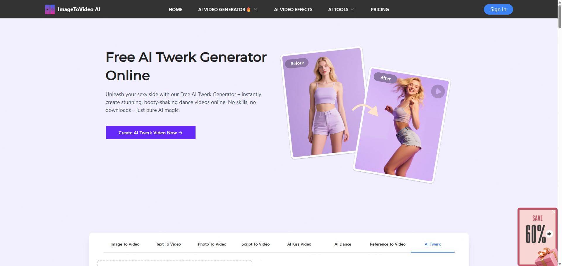Pour les utilisateurs recherchant un véritablegénérateur vidéo ai twerk gratuit,ImageToVideo IApropose des exportations vidéo HD illimitées sans filigrane. Il est optimisé pour une utilisation mobile et ne nécessite aucune inscription.