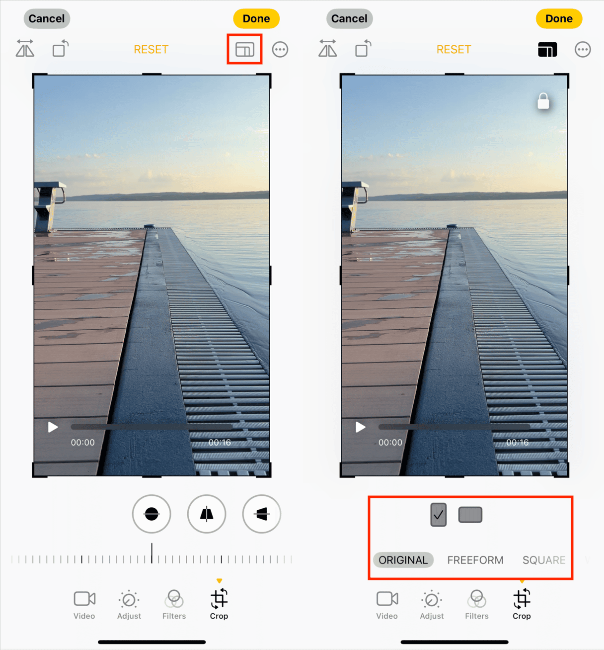 Si vous souhaitez recadrer la vidéo après l'étape 3, appuyez sur le bouton Ratio de recadrage en haut à droite. Vous pouvez choisir parmi :