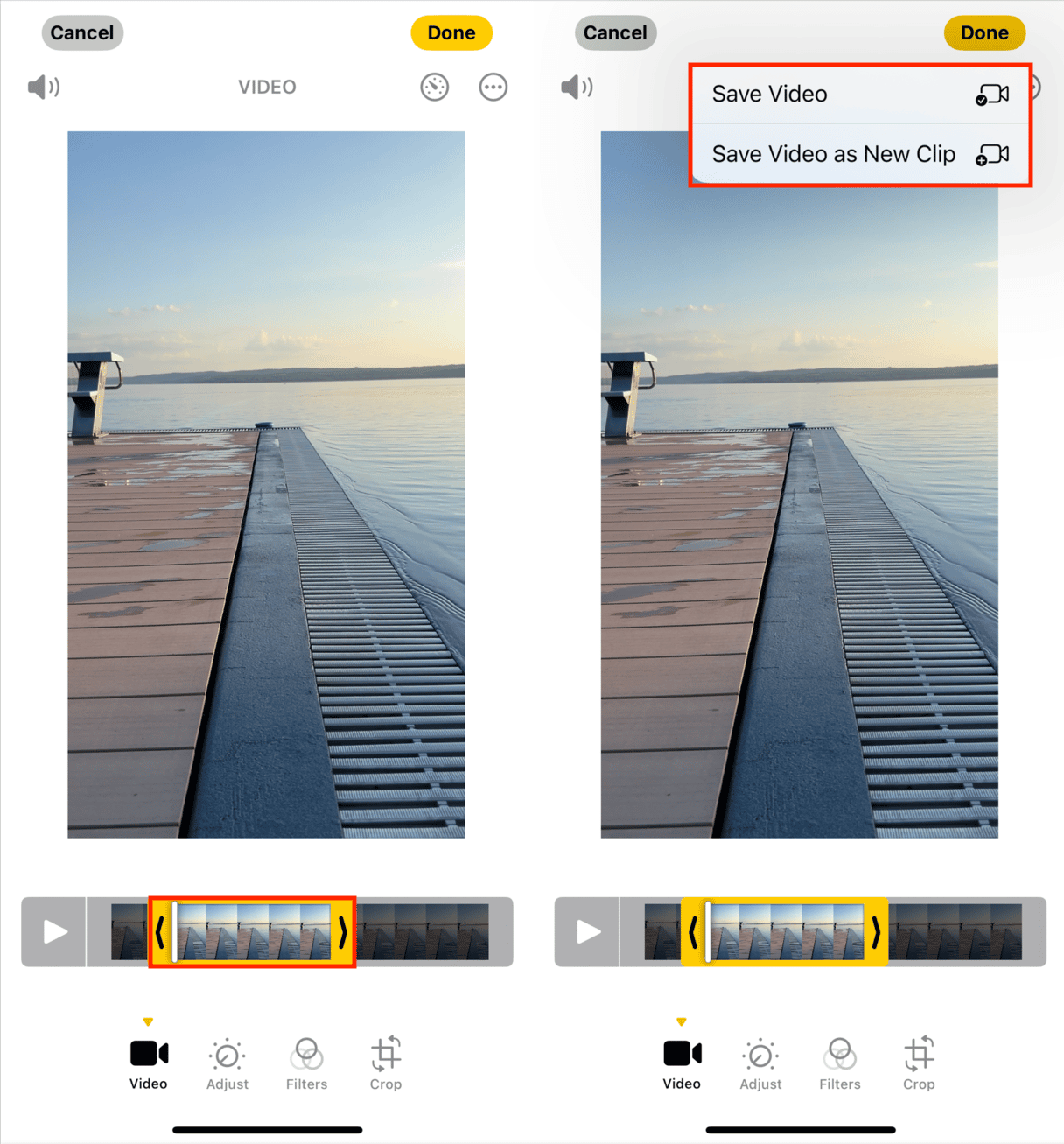 - Lorsque vous avez le cadre jaune autour de la section vidéo que vous souhaitez conserver, appuyez sur Terminé.