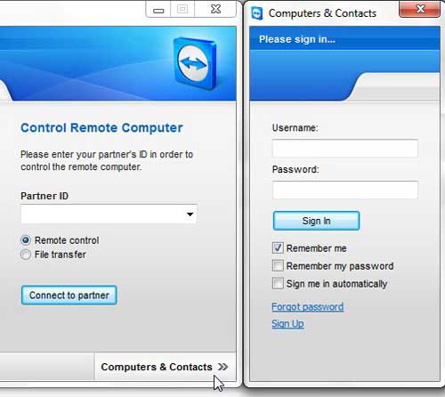 Si vous avez choisi de ne pas démarrer Teamviewer à chaque démarrage de votre ordinateur, vous devrez alors lancer le programme depuis le menu Démarrer, cliquer sur le boutonOrdinateurs et contactsdans le coin inférieur droit de la fenêtre, puis saisissez votre nom d'utilisateur et votre mot de passe pour vous connecter aux autres ordinateurs de votre compte Teamviewer.
