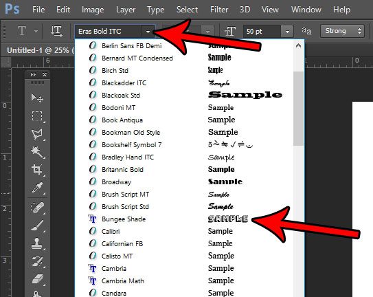 Vous pouvez confirmer que vous avez ajouté la police à Photoshop CS5 en lançant le programme, en cliquant sur le boutonTextedans la barre d'outils sur le côté gauche de la fenêtre, puis en cliquant sur l'icôneFontmenu déroulant pour trouver votre police nouvellement installée.