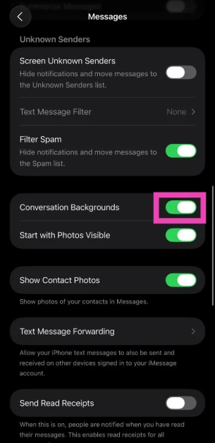 Étape 4 :Éteignez l'interrupteur à bascule à côté deArrière-plans de conversations.