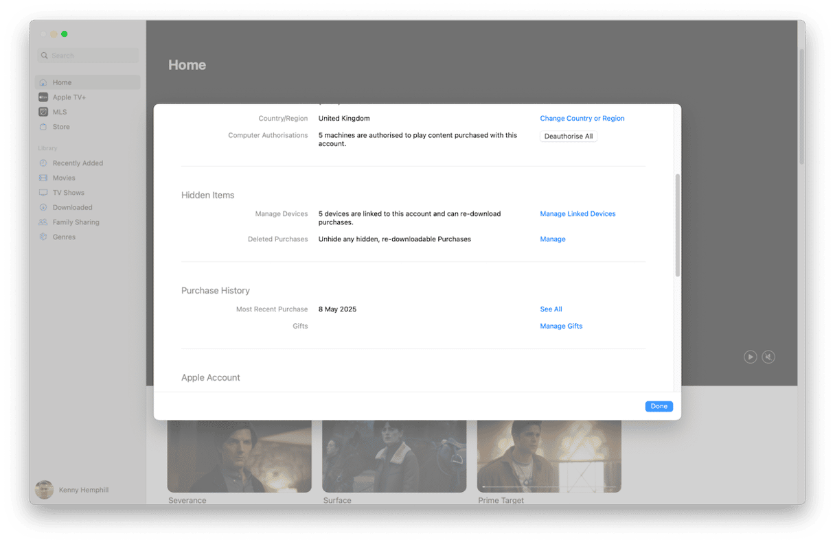 - Dans Apple TV ou Apple Music, cliquez sur le menu Compte et choisissez Paramètres du compte.
