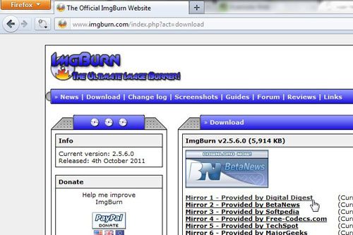 Étape 1 : Accédez à la page de téléchargement d'ImgBurn, puis cliquez sur le lien « Miroir 1 » au centre de la fenêtre.