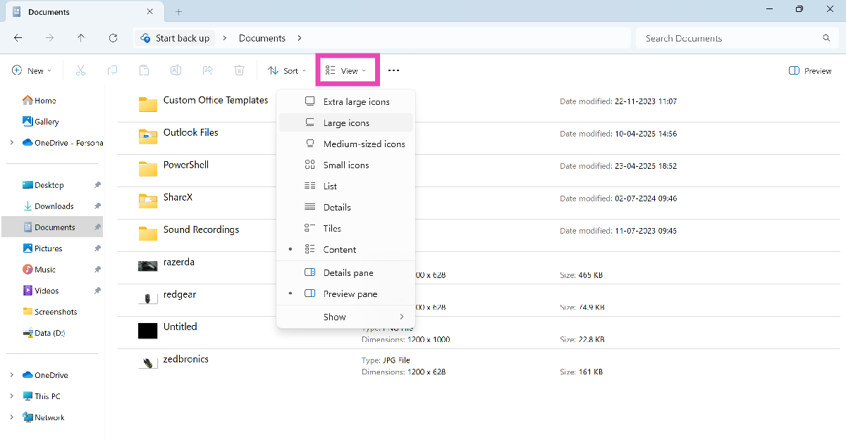 Ouvrez un dossier, cliquez sur Afficher et sélectionnez une option dans la liste. Vous pouvez également cliquer avec le bouton droit sur n’importe quel emplacement vide, déplacer le curseur sur « Affichage » et sélectionner une option.