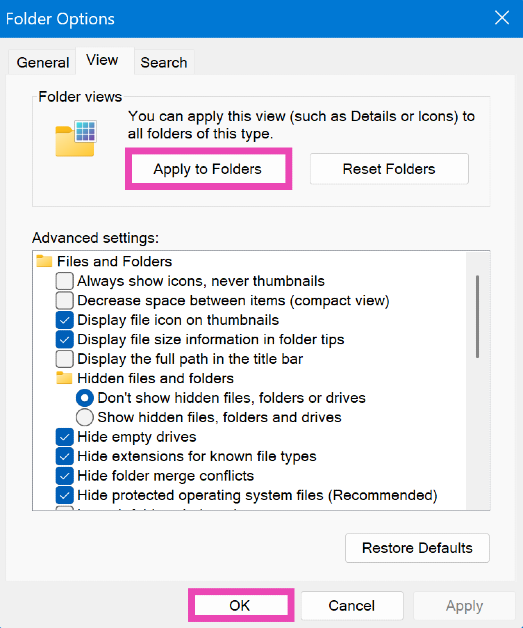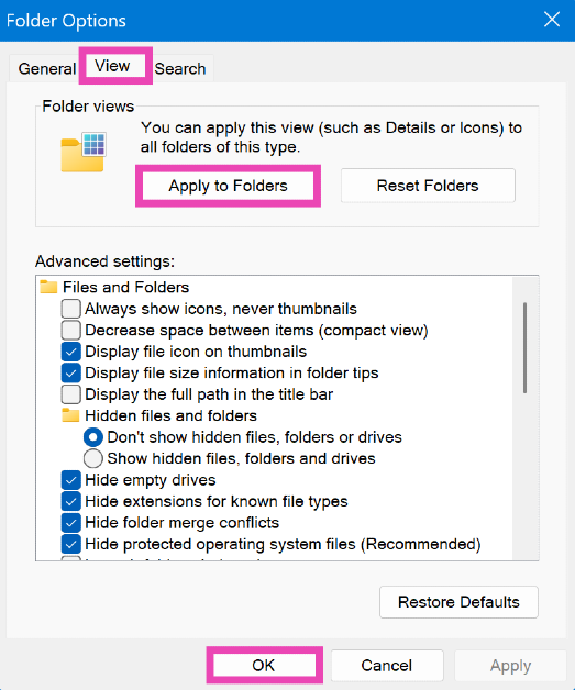 Étape 5 :Allez auVoironglet et cliquez surAppliquer aux dossiers.